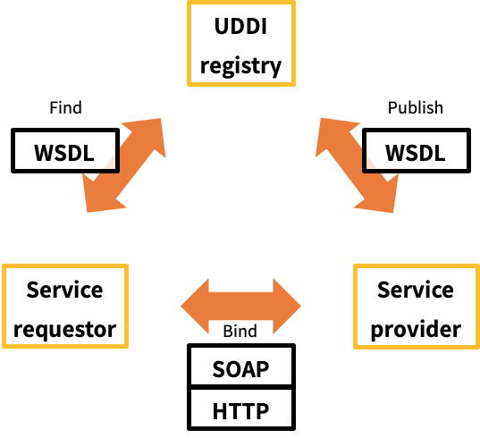 UDDI 레지스트리를 통해 웹서비스를 등록(Publish)하고, 탐색(Find)하고, 바인딩(Bind)하여 사용